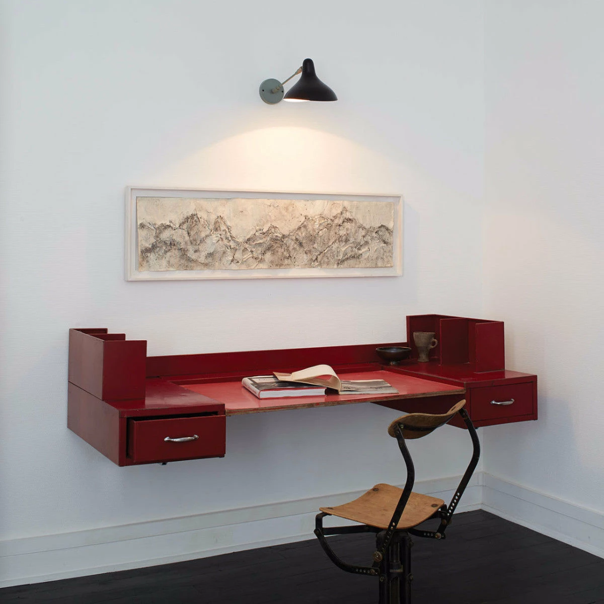 In 1951,Ā BernardĀ Schottlander designed and created the Mantis series of lamps. Movement is intrinsic to all of Schottlanderās work: an artist, an engineer and in no small measure a handyman, he devised a clever system of counterweights combined with a series of strong, and flexible metal bars.The shade also is unique of its kind. Like an acrobat suspended in mid-air, it is made from aluminium using spinning and chasing techniques that are a part of the metalworkerās inventory of skills, but to which he has brought his sculptorās eye to create a helical movement in which the symmetrical and the asymmetrical are in opposition.
