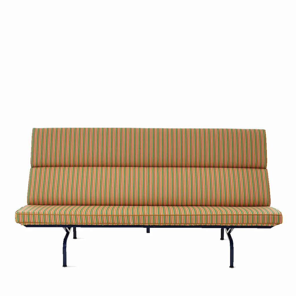 Inspired by a built-in that designers Charles and Ray Eames created for their home in Pacific Palisades, California, the Eames Sofa Compact (1954) sits on an airy pedestal of steel legs. For this special Herman Miller x HAY edition, textile brand Maharam faithfully reissued the previously discontinued colourway of Jacob’s Coat by Alexander Girard at the behest of Mette Hay. The powerful combination of the Eameses’ original design and Hay’s relevant point-of-view presents a reimagined classic of timeless appeal.